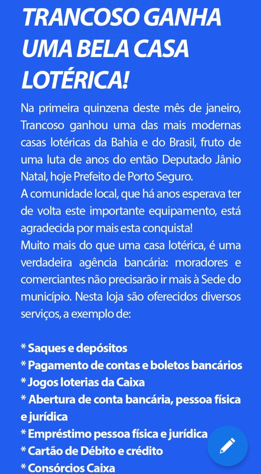 Pleito do Prefeito Jânio Natal, ainda como Dep. Estadual, contempla moradores de Trancoso em Porto Seguro – BA NotíciasPorto Seguro Por Josemir Tadeu Fonseca Ultimas atualizações 16 Jan, 2023 0 Compartilhar Bahiadestaquelotericaporto segurotrancoso 0 Compartilhar FacebookTwitterGoogle+WhatsAppO emailLinkedin