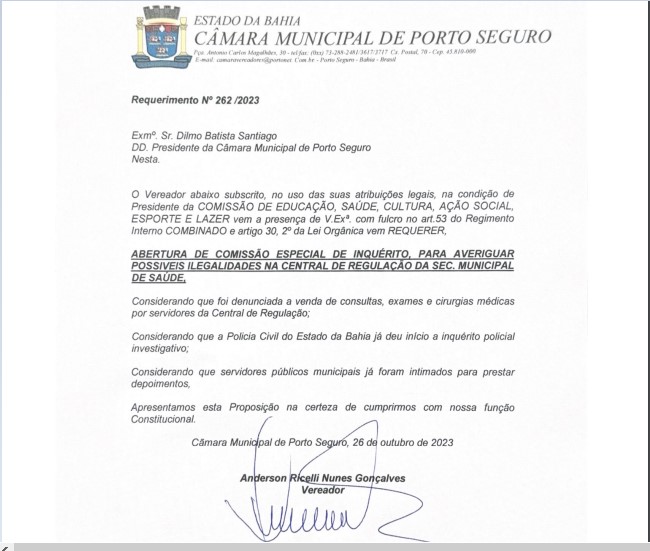 O vereador de Porto Seguro, Dr. Anderson (PODE), protocolou um requerimento solicitando a abertura de uma Comissão Especial de Inquérito com o objetivo de averiguar possíveis ilegalidades na Central de Regulação da Secretaria Municipal de Saúde do município. O pedido foi comunicado horas antes, durante o pronunciamento do vereador na sessão da Câmara de Vereadores de Porto Seguro. Dr. Anderson fez questão de frisar que as ações ilícitas que hipoteticamente estejam ocorrendo, sendo, inclusive, objeto de investigação em andamento da Polícia Civil, já com tomada de depoimentos, são à revelia da administração municipal que não compactua com esses delitos.