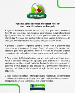 A Vigilância Sanitária de Eunápolis (BA) identificou a procedência de uma catinga horrível, propagada no município e, em uma ação rápida, notificou uma propriedade rural, localizada nas imediações do Bairro Encanto das Águas, como responsável pelo evento.