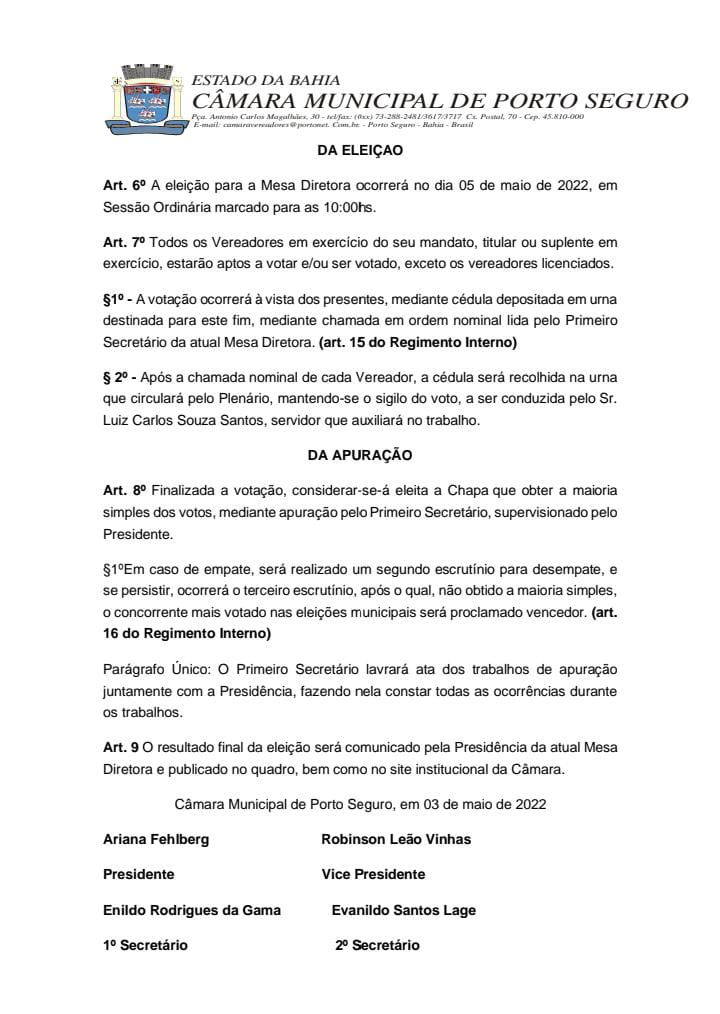 De forma extemporânea e inédita, a Câmara de Vereadores de Porto Seguro divulgou nesta terça-feira, (03/05) pauta da 12ª sessão Ordinária do primeiro Período Legislativo de 2022, onde consta na “Ordem do Dia”, Eleição para a Mesa Diretora da Casa, em votação única e secreta.