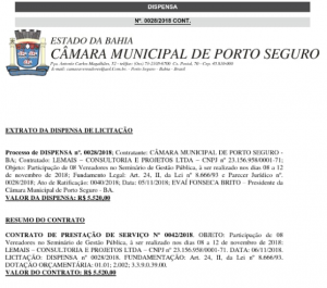 A câmara municipal de vereadores de Porto Seguro publicou nesta terça-feira, 06/11, Extrato de Dispensa de Licitação e Resumo do Contrato com a empresa LEMAIS- Consultoria e Projetos LTDA, sediada em Aracaju –SE, no valor de R$ 5.520,00 referentes à participação de 08 vereadores em seminário em Porto Alegre- RS.