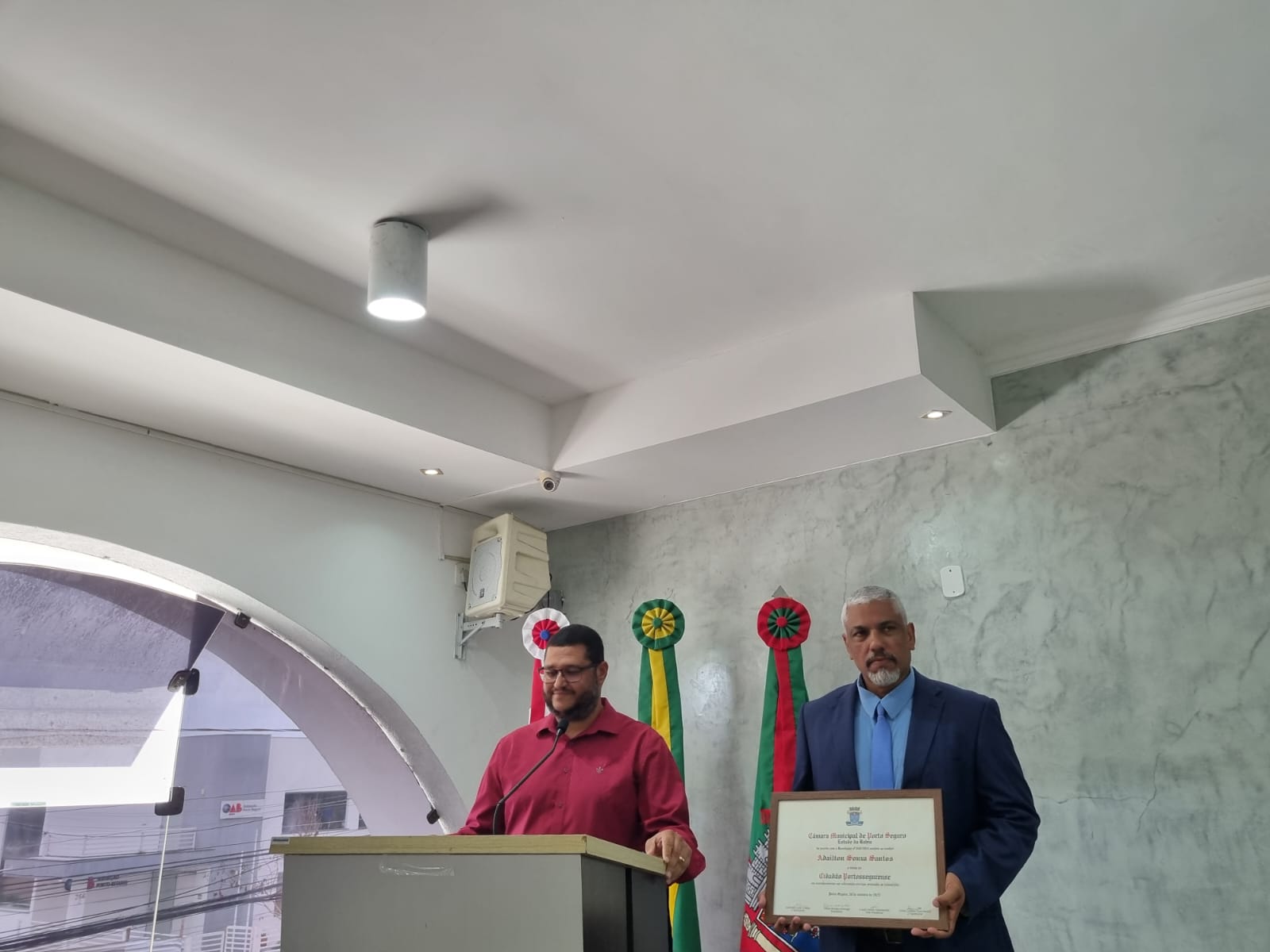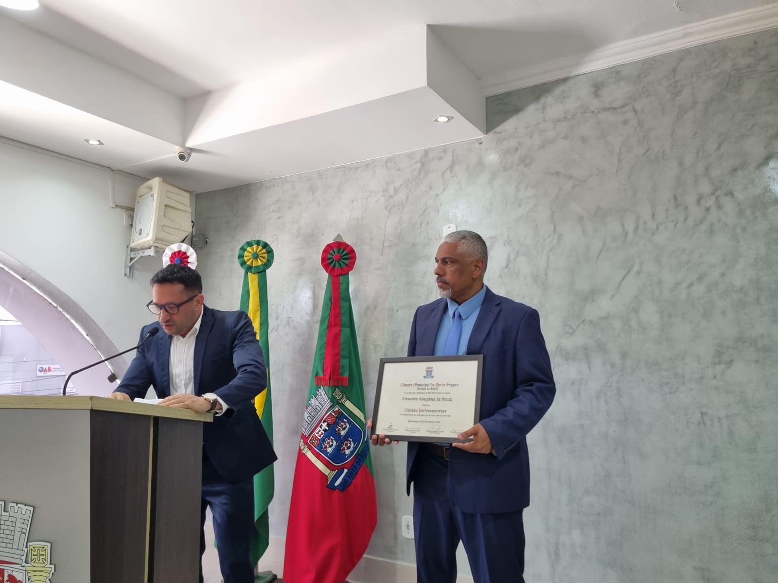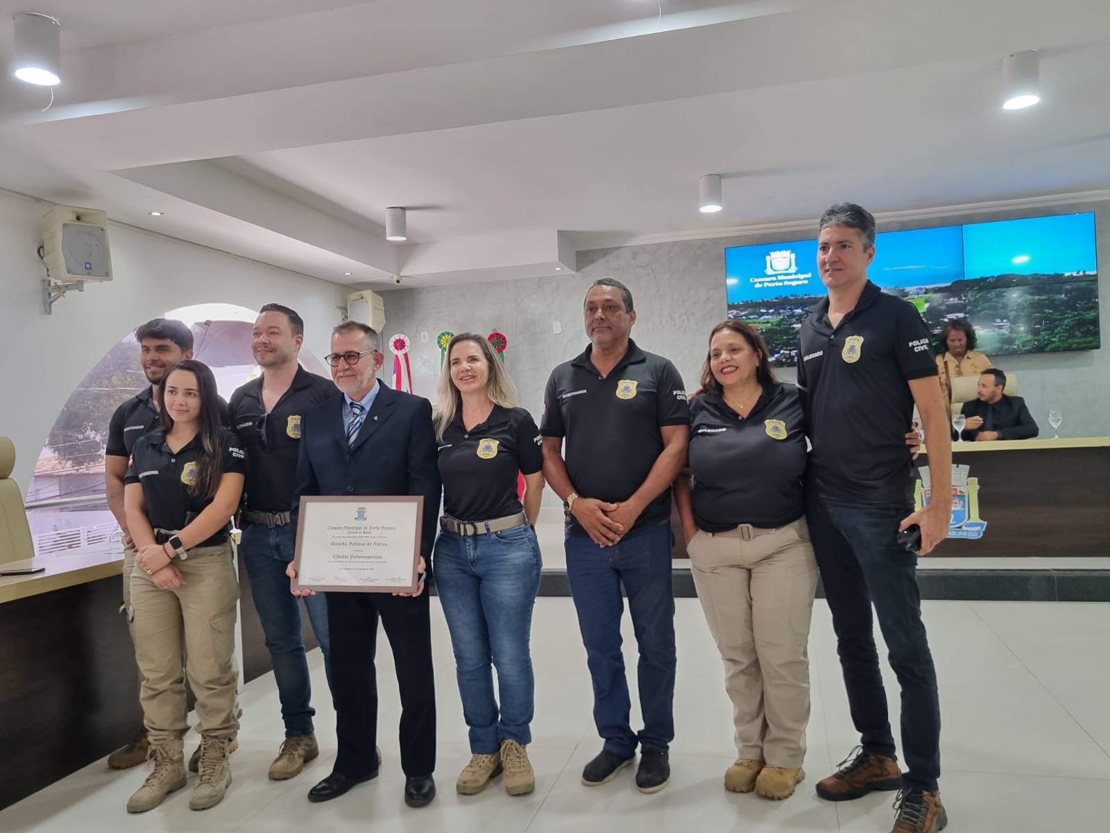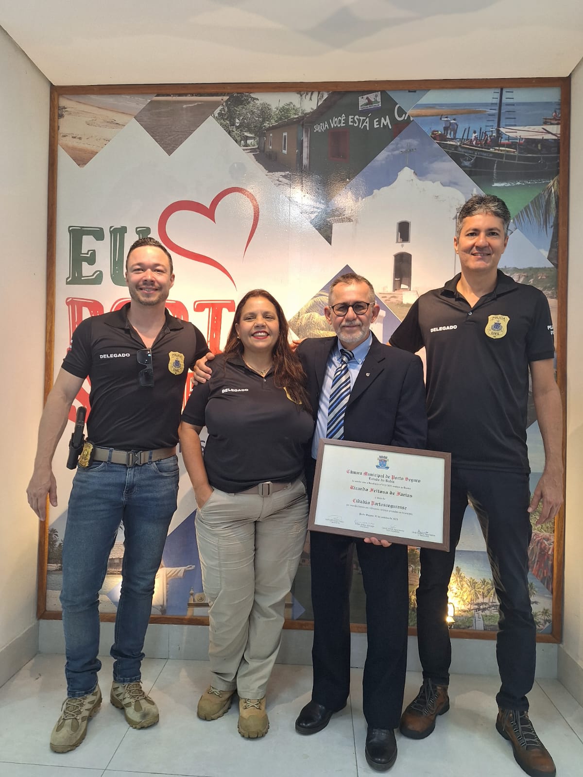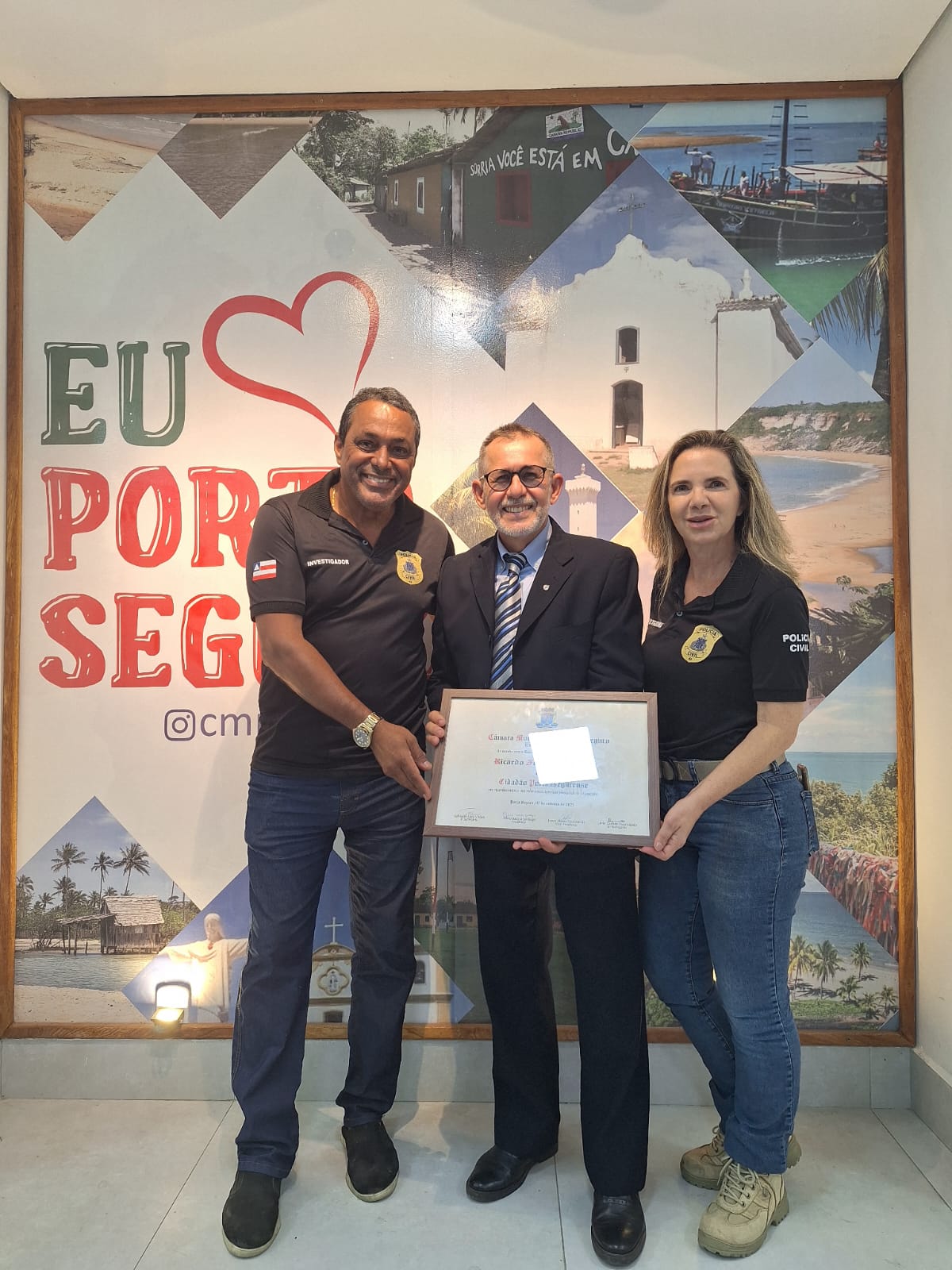 A noite desta terça-feira (11/11) foi marcada por emoção e reconhecimento na Câmara Municipal de Porto Seguro, durante a sessão solene que homenageou três personalidades que se destacam por suas trajetórias profissionais e contribuições à sociedade portossegurense. O médico Alexandre Gonçalves, o empresário Adailton Souza Santos e o delegado da DEAM, Renato Feitosa de Farias, receberam o Título de Cidadão Honorário de Porto Seguro, a mais alta honraria concedida pelo município.