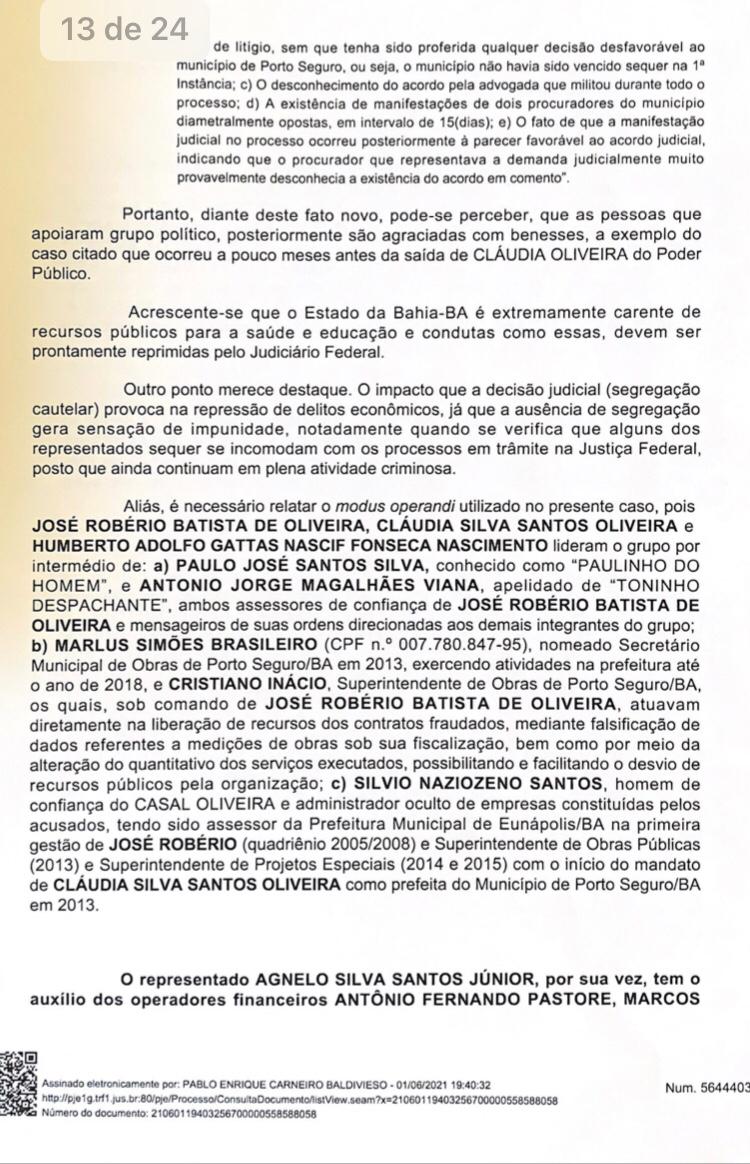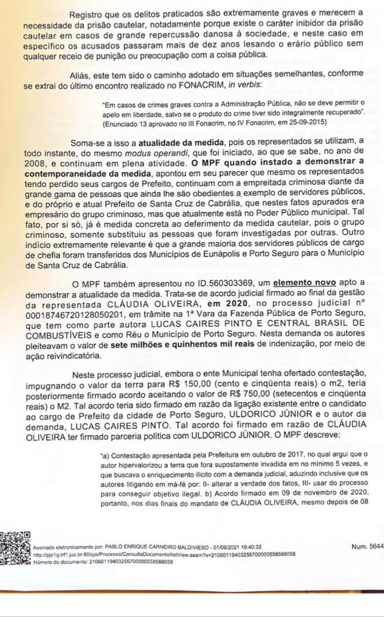 A decisão cita o acordo judicial firmado ao final da gestão de Cláudia Oliveira, que tem como parte autora, Lucio Caires Pinto e a Central Brasil de Combustíveis. “Nesta demanda, os autores pleiteavam o valor de R$7,5 milhões de indenização, por meio de ação reivindicatória. Neste processo judicial, embora o ente Municipal tenha ofertado contestação, impugnando o valor da terra para R$150,00 o metro quadrado, teria posteriormente firmado acordo aceitando o valor de R$750,00, o metro quadrado. Tal acordo teria sido firmado em razão da ligação existente entre o candidato ao cargo de prefeito, Uldurico Jr. e o autor da demanda Lucas Caires Pinto. Tal acordo foi firmado em razão da Cláudia Oliveira ter firmado parceria política com Uldurico Jr.”, trecho retirado da decisão judicial do inquérito que investiga a família Oliveira por diversos crimes praticados nos municípios de Porto Seguro, Eunápolis e Santa Cruz Cabrália.