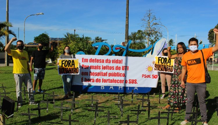 Um grupo de 10 representantes de diversos movimentos sociais da cidade protestou, nesta quinta-feira (02/07), no Trevo do Cabral, para chamar atenção à necessidade de mais leitos de UTI em Porto Seguro. Sem aglomeração, em silêncio, com máscaras e cartazes, os manifestantes fixaram 60 cruzes no gramado da praça, representando as mais de 60 mil mortes pela covid-19 no Brasil. Numa das faixas, havia o pedido de fortalecimento do SUS e de defesa da vida.