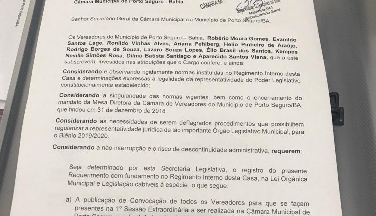 Mais uma vez foi feito um requerimento, subscrito pelos vereadores presentes (onze), protocolado na secretaria da Casa, solicitando uma sessão extraordinária para o dia 4/01/2019, sexta-feira, às 16 horas, na Câmara Municipal, que será conduzida pelo vereador mais velho, Robério Moura, de acordo O RI, quando se tentará delinear o procedimento da escolha da nova mesa diretora para o biênio 2019/20.