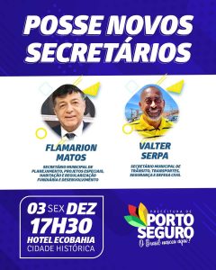 Será nesta sexta-feira, 3/12, às 17h30, no Hotel Eco Bahia, na Cidade Histórica, a posse dos novos secretários municipais, que vão reforçar o time de gestores da administração pública em Porto Seguro. São eles o secretário de Trânsito, Transportes, Segurança e Defesa Civil, Valter Serpa, e o secretário de Planejamento, Projetos Especiais, Habitação, e Regularização Fundiária e Desenvolvimento, Flamarion Matos. Dois novos colaboradores que se integram à administração “Sob Nova Direção”