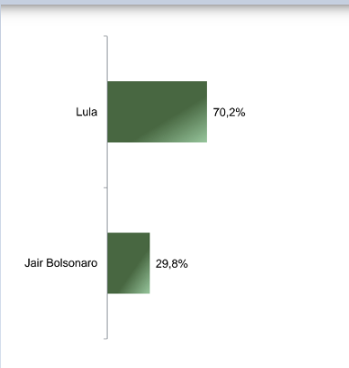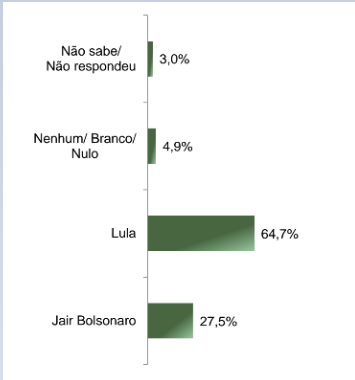 No cenário de votos totais, Lula aparece com 64,7% das intenções de voto contra 27,5% de Bolsonaro. 4,9% dos entrevistados disseram que votam nulo, branco ou nenhum dos candidatos e 3% não souberam responder.