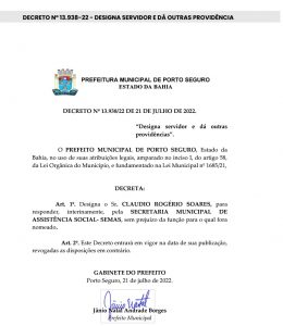 O Subsecretário Municipal de Ações Sociais, Cláudio Rogério Soares foi designado na última quinta-feira (21/07), através do decreto 13 938/22, novo Secretário de Assistência Social (SEMAS) do município de Porto Seguro.