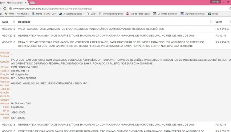 Mesmo cientes do caos político, administrativo e financeiro que o município atravessa, o vereador e presidente da câmara de vereadores de Porto Seguro, Evaí Fonseca, na companhia do vereador e secretário da mesa diretora Robson Vinhas, partiram rumo a Brasília, com diárias e passagens pagas pelo erário público.