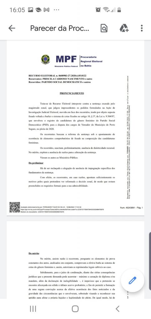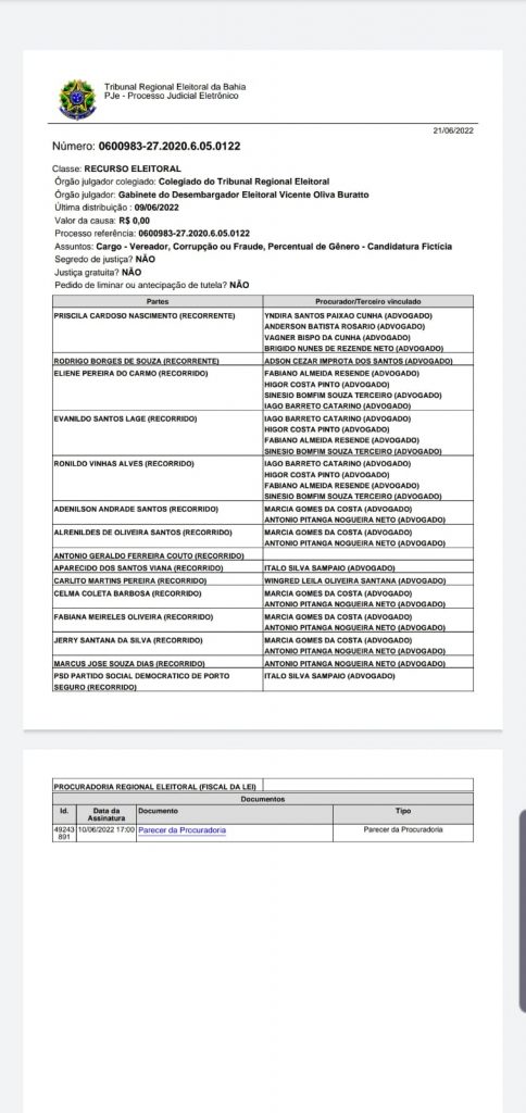 O Procurador Regional Eleitoral, Fernando Túlio da Silva, em análise de recurso interposto pelos candidatos a vereador Priscila Cardoso Nascimento e Rodrigo Borges, deu parecer favorável ao pleito dos mesmos, em parecer publicado pelo MPF (Ministério Público Federal) em 10/06/2022.