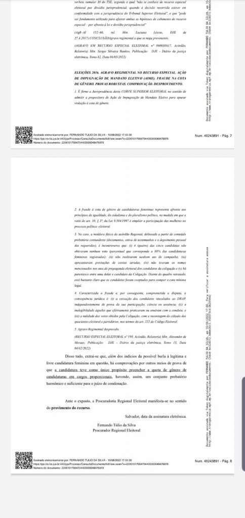Fernando Túlio da Silva considerou ainda que, “os elementos de prova trazidos aos autos, corroborados por provas produzidas sob o crivo do contraditório, que se ligam às demais provas colacionadas, traduzem o juízo de convicção das fraudes efetivadas ao sistema de cotas do gênero feminino nas eleições de 2020 em Porto Seguro”.