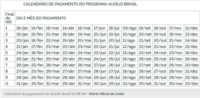 Em janeiro, o valor mínimo do Auxílio Brasil voltará a R$ 400, a menos que uma nova proposta de emenda à Constituição seja aprovada. Tradicionalmente, as datas do Auxílio Brasil seguem o modelo do Bolsa Família, que pagava nos dez últimos dias úteis do mês. No entanto, uma portaria editada no início deste mês antecipou o pagamento da parcela de agosto para o período de 9 a 22.