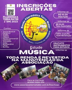 A Banda Filarmônica Terra Mater, com sede provisória na Av. Navegantes 1572, divulgou nesta sexta-feira, (9/06), a abertura de inscrições para aqueles que desejam estudar música e/ou aprender a tocar um instrumento musical.