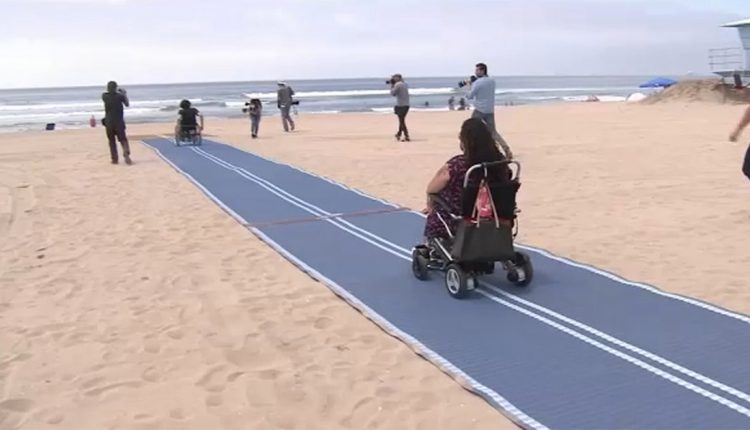 Em Huntington Beach, na Califórnia (EUA), o acesso à praia para cadeirantes ficou mais fácil graças a um tapete que percorre toda a areia até a beira da água.