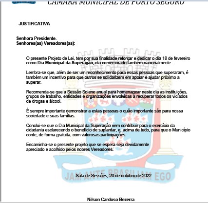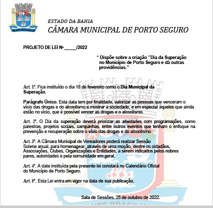 A última sessão da Câmara, realizada em 10/11/2022, aprovou, por unanimidade, o Projeto de Lei do vereador Nilsão, Nº 058/2022, que cria o “Dia da Superação” no município de Porto Seguro. (relembre aqui)