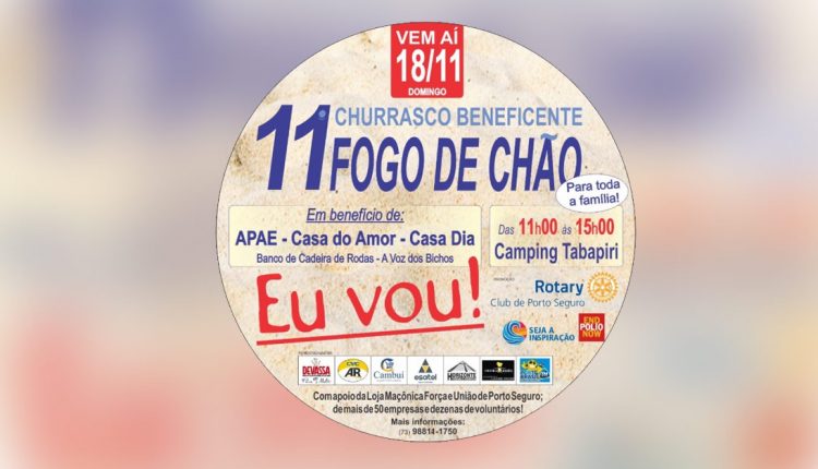 Será neste domingo, 18/11, o tradicional churrasco beneficente promovido pelo Rotary Club de Porto Seguro – 11º Fogo de Chão -. O evento acontece anualmente no Camping Tabapiri, e neste ano, além de dezenas de voluntários, conta com a parceria da Loja Maçônica Força e União, dos Rotarys de Porto Seguro e Arraial D’ajuda e dezenas de empresas patrocinadoras.