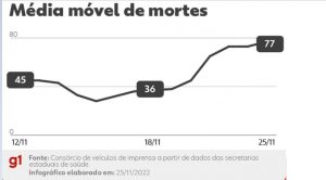 - Média de mortes nos últimos 7 dias: 73 (variação em 14 dias: +59%)
