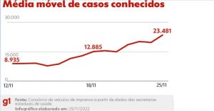 Já os casos conhecidos passaram da casa dos 56 mil registrados em 24 horas, o que fez a média móvel subir e passar de 23 mil, no maior valor registrado desde agosto deste ano.