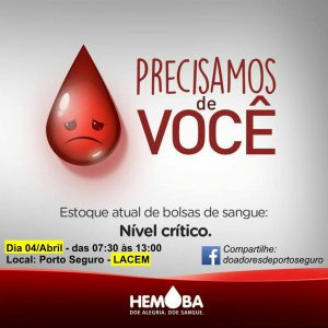 Com o atual estoque de bolsas de sangue em estado crítico, o Lacem convoca toda a população portossegurense para realizar a doação de sangue, amanhã, 4 de abril, entre 7h30 e 13h, na Rua Bernardo Spector, ao lado do Posto de Saúde em frente ao Estádio Municipal de Porto Seguro.