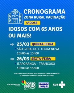 Em São Geraldo e Terra Nova, Itaporanga e Trancoso, a vacinação será das 10 às 15 horas dos dias 25 e 26 de março.