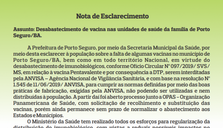 Após matéria veiculada aqui no JoJô notícias, em 14/01, onde moradores cobravam, com imensa indignação, a falta de vacinas básicas e que fazem parte do calendário nacional de vacinação(leia aqui), a prefeitura municipal de Porto Seguro resolveu divulgar “nota de esclarecimento” à população, justificando o desabastecimento.