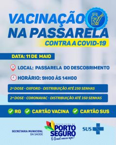 A Prefeitura Municipal de Porto Seguro, através da Secretaria de Saúde, realiza nesta terça-feira, (11/05), mais uma grande mobilização para aplicação da 2ª dose da vacina.