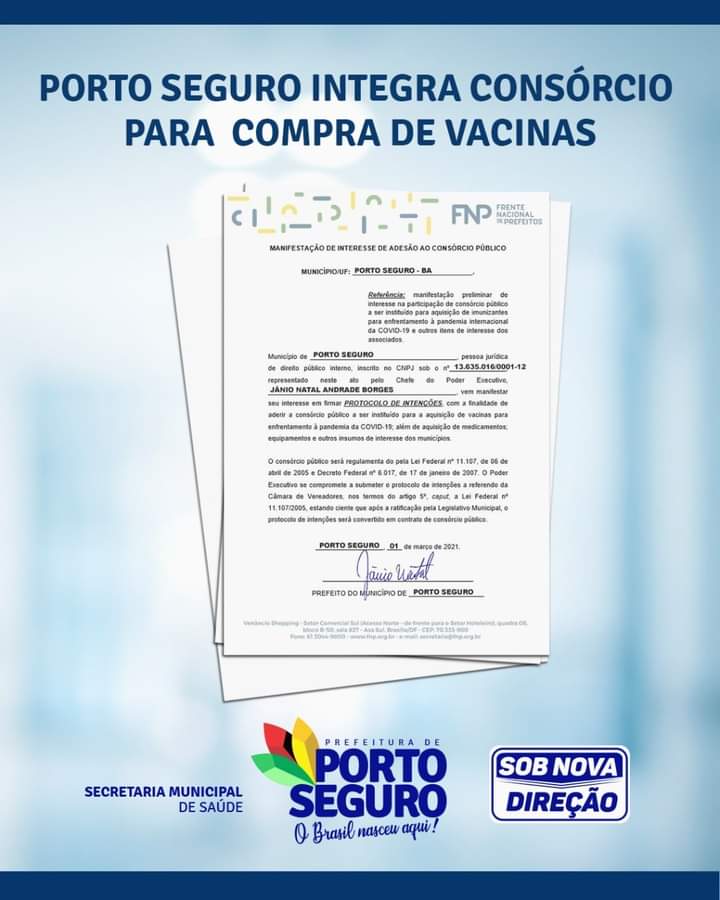Por este motivo, o Prefeito Jânio Natal formalizou, nesta segunda-feira, 1 de março, a adesão de Porto Seguro ao Consórcio da Frente Nacional de Prefeitos, cujo objetivo é a compra de vacinas contra a COVID-19 .