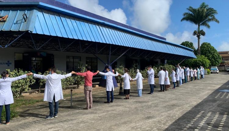 O corpo clínico do Hospital Deputado Luís Eduardo Magalhães, juntamente com profissionais de outras áreas da instituição, em Porto Seguro, fez um cordão humano, numa espécie de abraço simbólico à instituição.