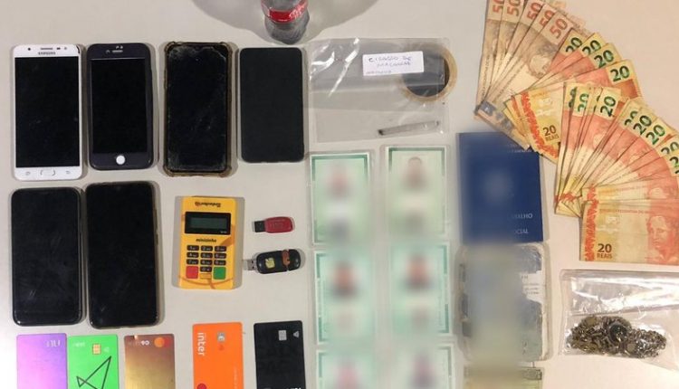 Com o grupo foram apreendidos R$ 712 em espécie, 14 cartões bancários, uma máquina de débito e crédito, cinco aparelhos celulares, nove documentos de identidade e duas Carteiras Nacionais de Habilitação (CNH), além de um cigarro de maconha e um líquido químico não identificado. Eles foram autuados por uso de documento falso, falsidade ideológica, estelionato, associação criminosa e posse de entorpecente.