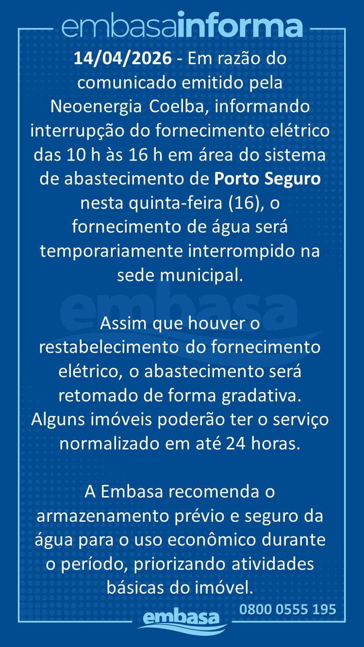A Embasa informou, por meio de comunicado divulgado nesta terça-feira (14/04), que o abastecimento de água será temporariamente interrompido no município de Porto Seguro na próxima quinta-feira (16/04).