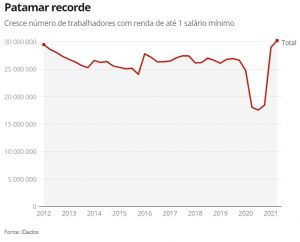 No Brasil da alta inflação, 30,2 milhões de pessoas – pouco mais do que toda a população da Venezuela – sobrevivem com até um salário mínimo. Nunca tantos estiveram nessa condição. A quantidade de brasileiros que consegue uma renda mensal de até R$ 1,1 mil, obtida a partir do trabalho, atingiu um patamar recorde.