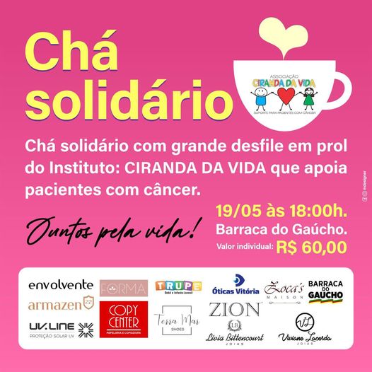 No dia 19 de maio, às 18:00 hs, na Barraca do Gaúcho, acontecerá o chá solidário com grande desfile em prol do Instituto Ciranda da Vida.