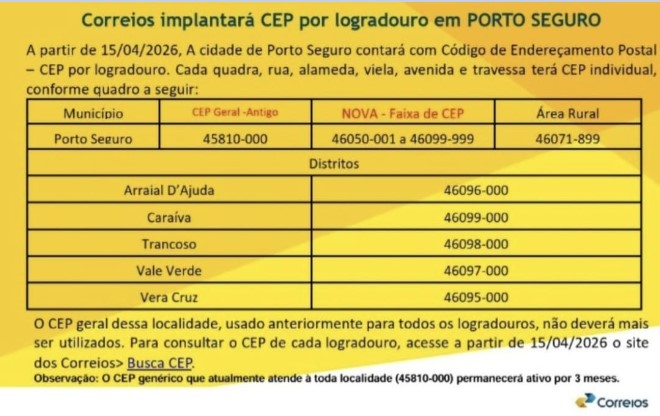 O Correios anunciou a implantação do sistema de Código de Endereçamento Postal (CEP) por logradouro no município de Porto Seguro. A mudança passa a valer a partir do próximo dia 15 de abril e promete trazer mais precisão e agilidade na identificação de endereços.