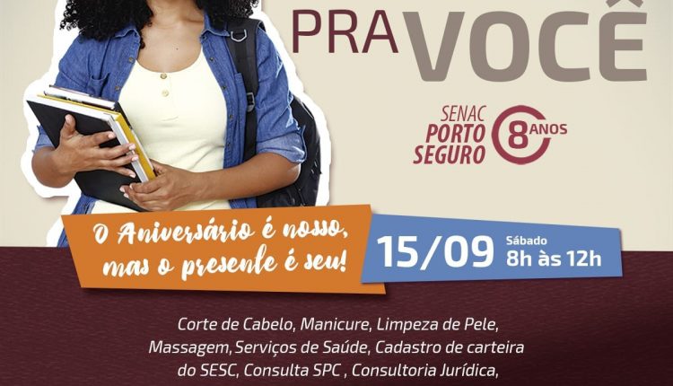 O SENAC PRA VOCÊ é um evento voltado para a comunidade, disponibilizando diversos serviços na área da saúde, beleza, consultoria jurídica, MEI, consulta ao SPC , cadastro da carteira do SESC e muito mais. O evento acontecerá no sábado dia 15/09 das hs 08:00 às 12:00, em homenagem aos 8 anos do SENAC em Porto Seguro.