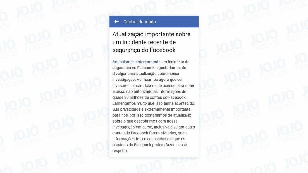 Facebook informou na tarde de terça-feira ( 16),aos brasileiros usuários da rede social que tiveram dados acessados por terceiros, cujas informações não foram protegidas devido à última falha de segurança da empresa, que atingiu 30 milhões de pessoas, encontram mensagens de aviso ao abrirem a rede social.
