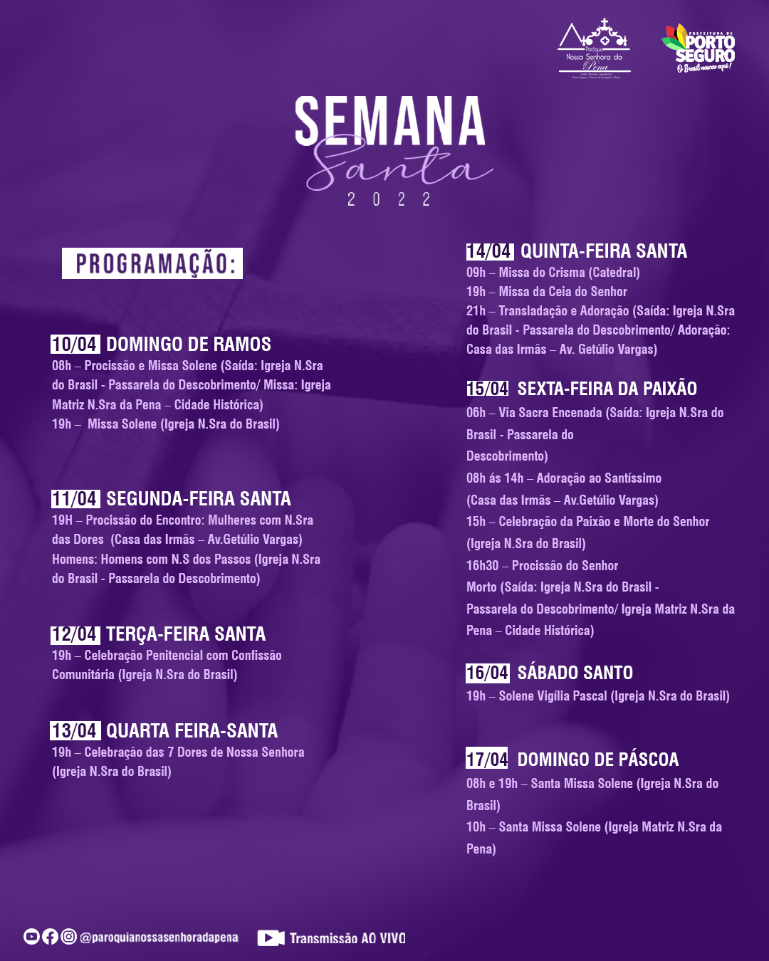 Todas as Celebrações serão transmitidas AO VIVO pelo Youtube @paroquianossasenhoradapena e pelas rádios PacataFm e VidaRenascer.