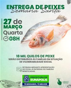 A Prefeitura de Eunápolis, liderada pela prefeita Cordelia, dará início nesta quarta-feira, dia 27 de março, à distribuição de 18 toneladas de peixes às famílias em situação de vulnerabilidade social no município. Essa é uma ação que vem sendo realizada há três anos consecutivos, nesse período religioso, reforçando o compromisso da administração municipal com a solidariedade e o amor ao próximo.