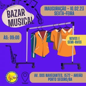 A Associação Banda Filarmônica Terra Mater, a nova Filarmônica de Porto Seguro-BA, localizada na Avenida Navegantes 1572, está organizando um Bazar de roupas seminovas, com intuito de arrecadar fundos para manutenção das oficinas de música e professores.