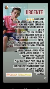 O jovem Michael, de 13 anos de idade, saiu na sexta-feira, (25/06) de sua casa, numa área de assentamento, depois do “Porto Do Boi” e, de acordo os parentes, encontra-se desaparecido.