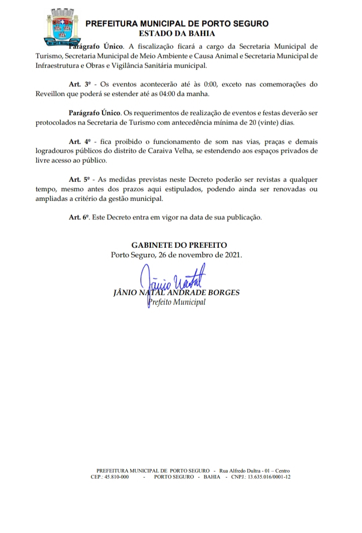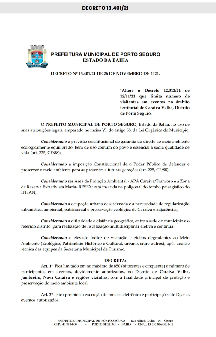 Em seu artigo 1º, o decreto limita em no máximo 850, o nº de participantes em eventos, devidamente autorizados, no distrito de Caraíva Velha, Jambreiro, Nova Caraíva e regiões vizinhas, com a finalidade principal de proteção e preservação do meio ambiente local. Além disso, proíbe a execução de música eletrônica e participações de “Djs” nos eventos autorizados.