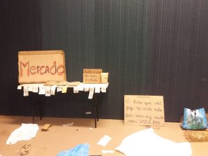 Todo tipo de lixo espalhado por todo o ambiente, fotografias do lixão local, cartazes com frases e informações escritas em papelão ou verso de papel cobrando participação e responsabilidade dos visitantes pelo lixo produzido, individualmente e socialmente, numa nítida provocação à reflexão do tema abordado. “Voce sabe quanto de lixo produz por dia?”, questiona os alunos.