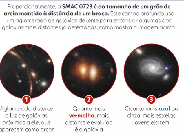 Segundo a Nasa, a imagem é a visão infravermelha mais profunda e nítida do universo até então. Nela, é possível ver um aglomerado de galáxias chamado de SMACS 0723, exatamente como ele era há cerca de 4,6 bilhões de anos.