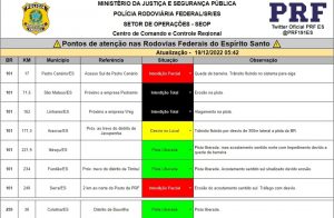 A PRF informou, na manhã desta segunda-feira (19/12), que houve erosão na pista e não há previsão de liberação; outro trecho, em Linhares, também tem interdição total devido a alagamento