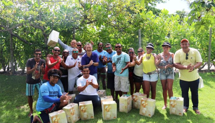 Ambulantes da Praia do Mutá comemorando o recebimento de cestas de Natal. Foto: Leonardo Cavalcanti