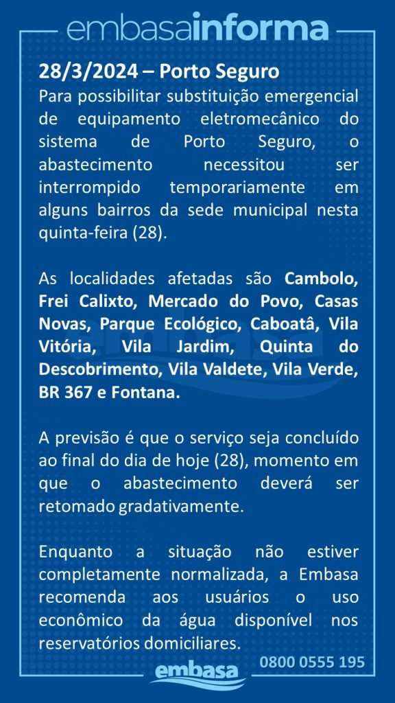 A Empresa Baiana de Águas e Saneamento S.A. (Embasa), concessionária de serviços de saneamento básico de quase todo o estado da Bahia e pertencente ao governo estadual, divulgou comunicado nesta quinta-feira, (28/03) a suspensão temporária no fornecimento de água em determinados bairros de Porto Seguro.