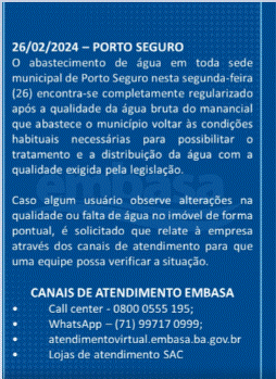A Embasa-Porto Seguro divulgou comunicado nesta segunda-feira (26/02) informando que o abastecimento de água no município foi restabelecido na sua plenitude; O serviço tinha sofrido interrupções em algumas localidades em função da necessidade de recuperação da qualidade da água bruta do manancial afetada pelo volume de chuvas.