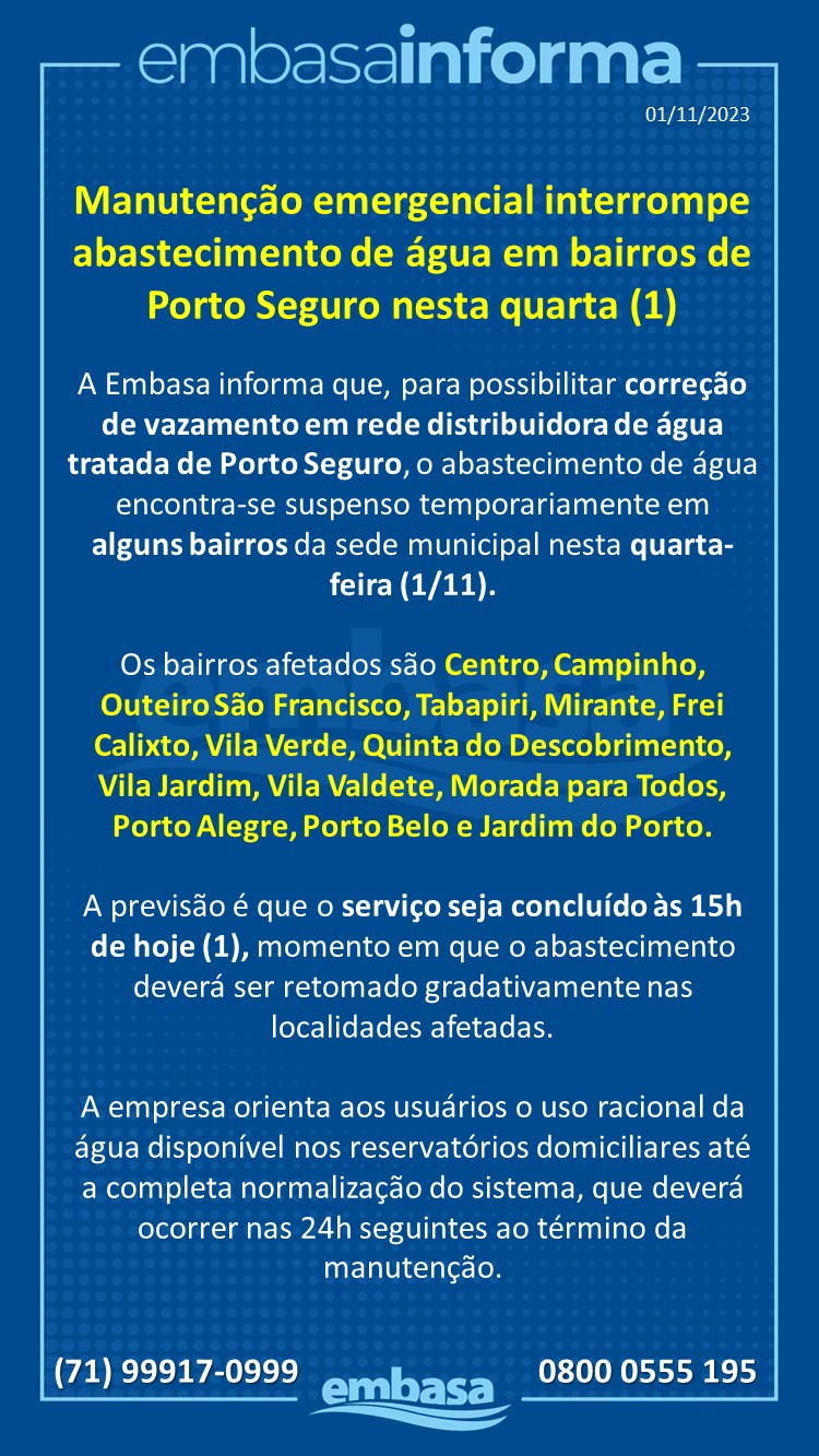 A Embasa informa que, para possibilitar correção de vazamento em rede distribuidora de água tratada de Porto Seguro, o abastecimento de água encontra-se suspenso temporariamente em alguns bairros da sede municipal nesta quarta-feira (1/11).